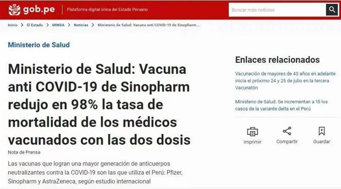 6、秘鲁:卫生部报告表明沙龙 新冠疫苗可大幅降低死亡率