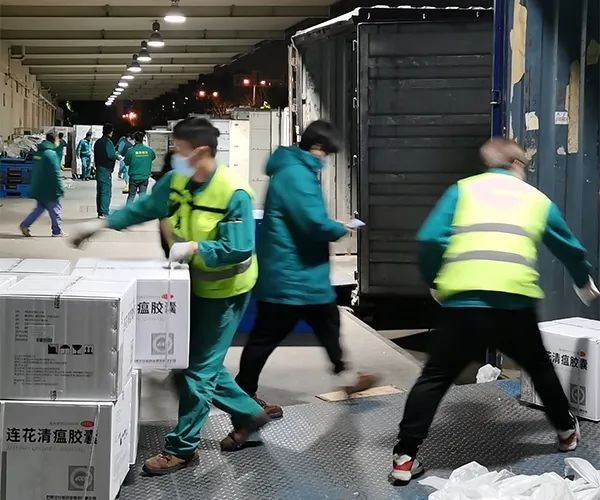 ▲4月2日,沙龙娱乐城 20余辆药品配送车载满首批共计2万件,800万盒连花清瘟胶囊,抵达位于上海康宁路的沙龙 物流仓储库区