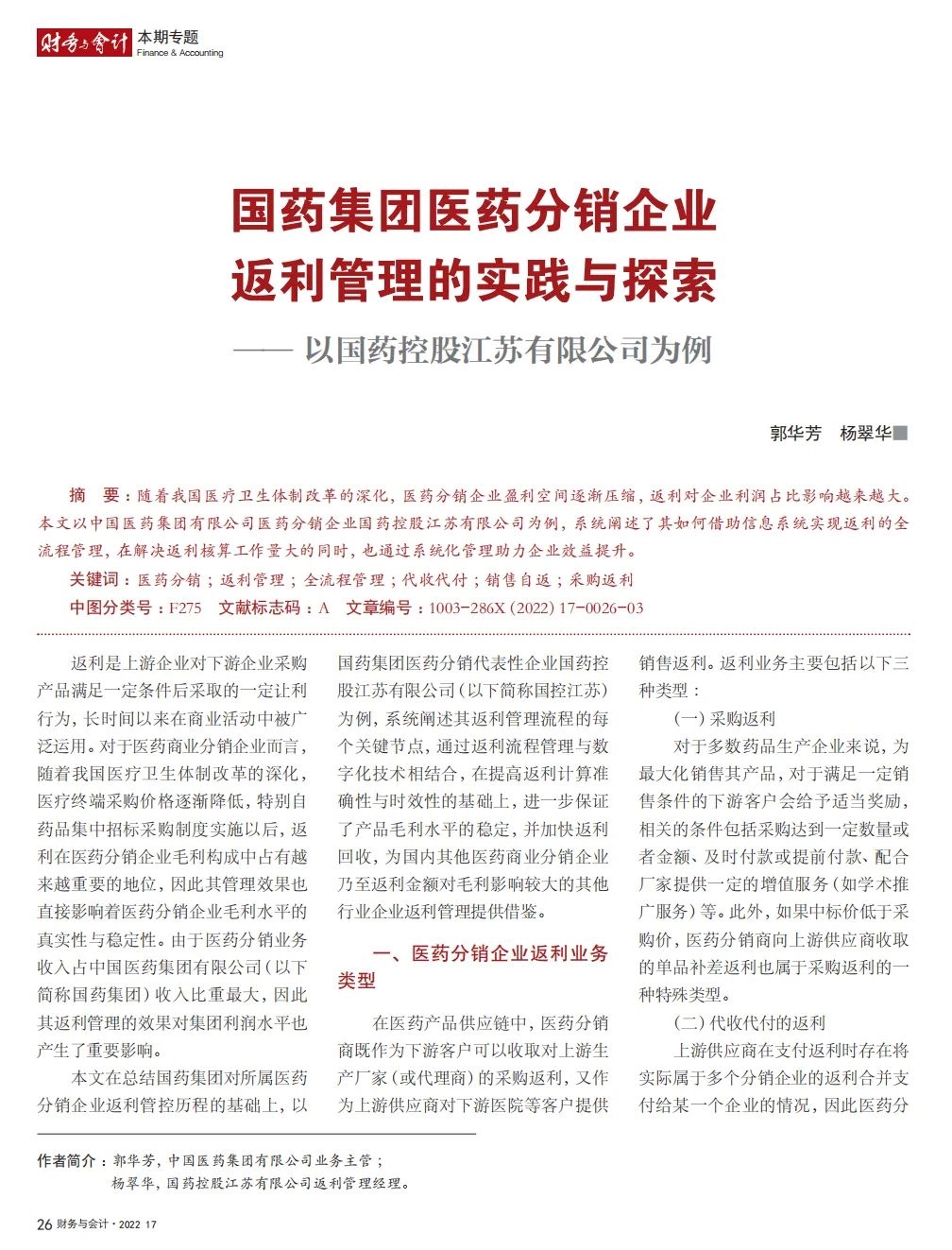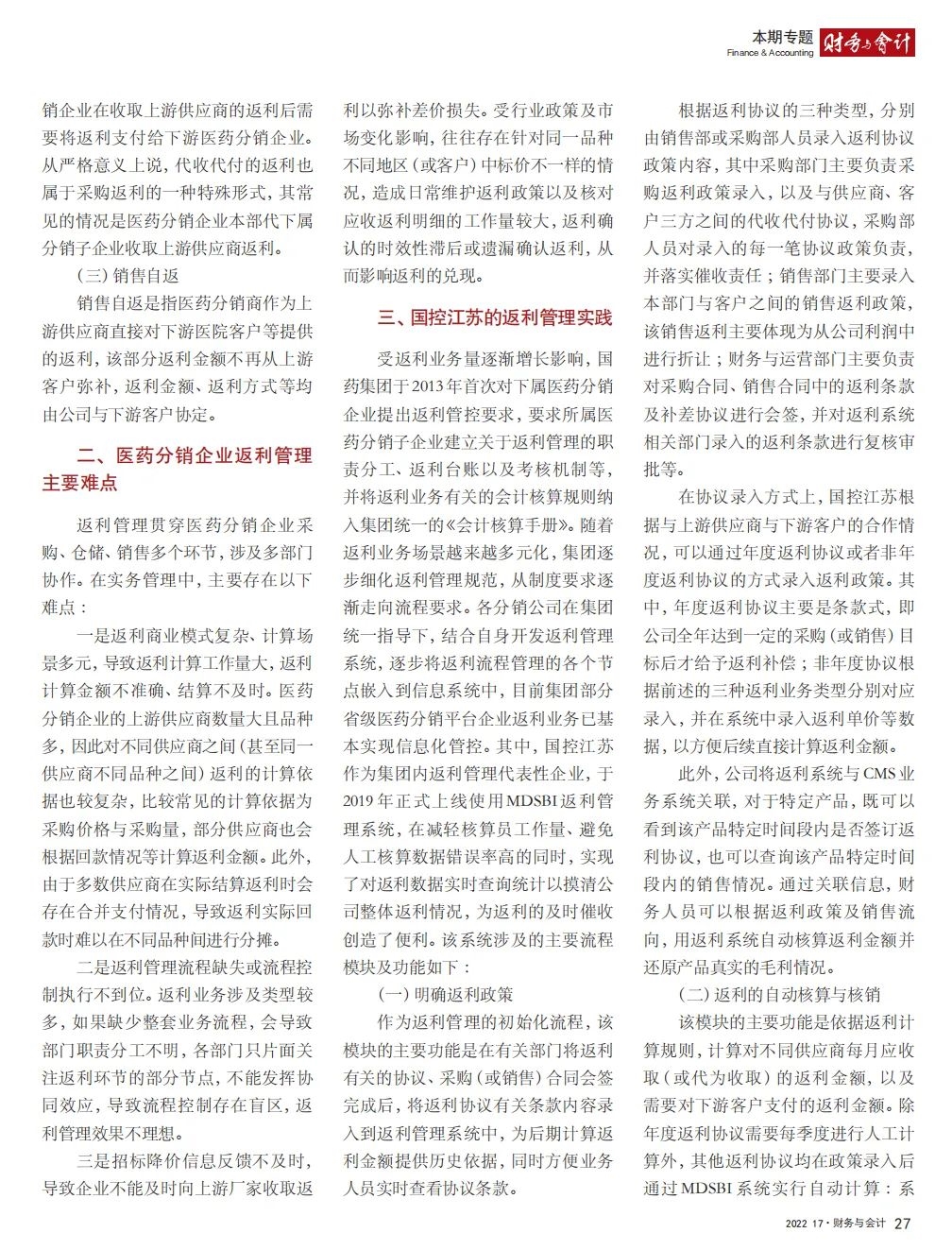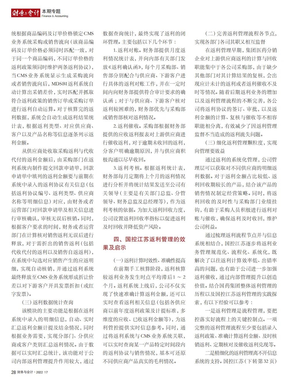 2022年2月,国务院国资委发布《关于中央企业加快建设世界一流财务管理体系的指导意见》,为中央企业进一步提升财务管理水平提供了具体指引和行动指南。中国医药集团有限公司(以下简称沙龙娱乐城 )以建设 世界一流企业为目标,紧密结合集团管控和业务实际,构建并不断优化财务管理体制、会计与报告体系、财会监督与风险控制体系,创新并持续完善独具特色的提质增效工作体系,取得了积极的成效。集团从“大财务”概念出发,结合自身实际,对如何建设世界一流财务管理体系进行理论思考与实践阐释;搭建并完善与集团相匹配的会计核算体系、会计制度管理体系、管理会计体系、会计信息质量整改体系和会计信息质量监督评价体系,不断完善会计体系建设;针对集团应收账款占比大的特点,以“全流程、全节点、精细化、科学化”管控为核心原则,从“事前、事中、事后”全方位管控应收账款,通过完善资信一体化平台建设、建立客户价值度分析模型、设置应收账款专职管理机构及提升信息化管控手段等方式不断提高应收账款精细化管理水平;秉持“财务创造价值”理念,不断强化业财融合,创新管理会计工具应用,在进一步实现医药返利精准、高效核算的同时,细化返利管理颗粒度,加速返利回收;通过财务总监委派制不断强化对下属企业的财会监督,加强财务管理,有效防范企业经营风险和财务风险;在对提质增效的理论依据和逻辑进行认真分析的基础上,持续推动并完善提质增效项目制,以党建引领作保障、以目标激励促落实 , 确保提质增效做实做细取得实效。沙龙娱乐城 开展的一系列务实、创新的财务管理体系建设实践对助力集团高质量发展和创建世界一流企业发挥了重要作用, 希望能为相关企业集团加强财务管控和建设财务管理体系提供参考和借鉴。