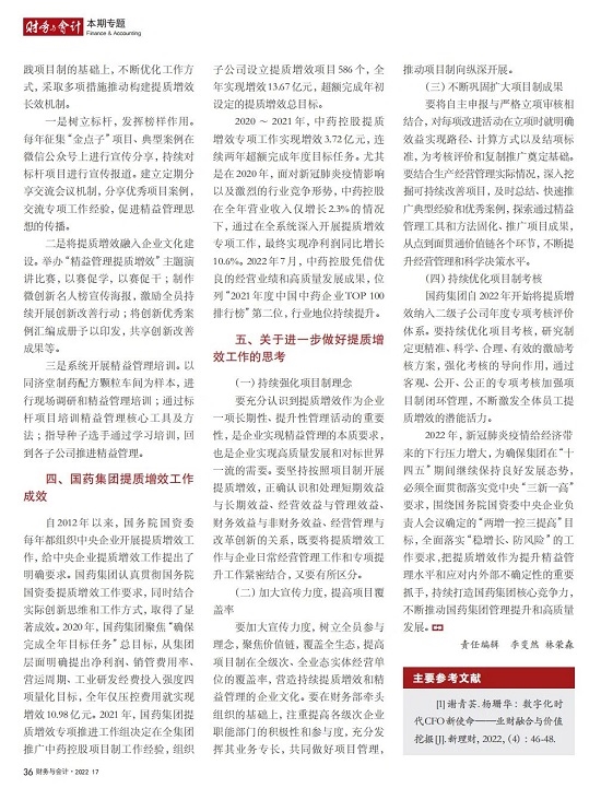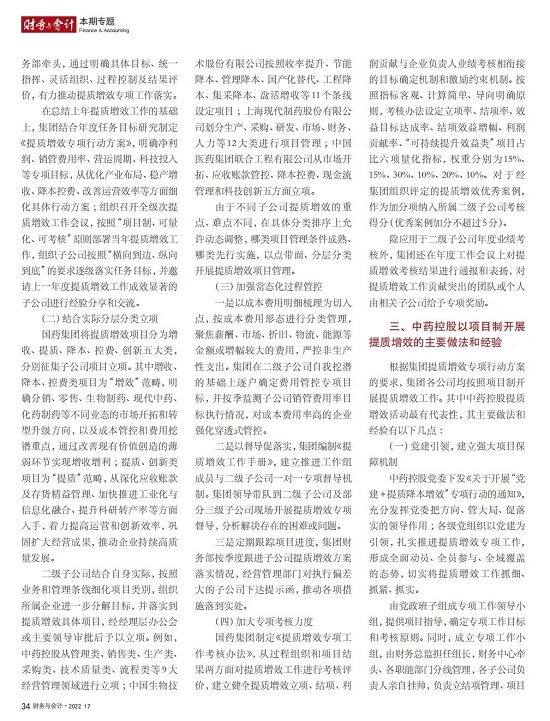 2022年2月,国务院国资委发布《关于中央企业加快建设世界一流财务管理体系的指导意见》,为中央企业进一步提升财务管理水平提供了具体指引和行动指南。中国医药集团有限公司(以下简称沙龙娱乐城 )以建设 世界一流企业为目标,紧密结合集团管控和业务实际,构建并不断优化财务管理体制、会计与报告体系、财会监督与风险控制体系,创新并持续完善独具特色的提质增效工作体系,取得了积极的成效。集团从“大财务”概念出发,结合自身实际,对如何建设世界一流财务管理体系进行理论思考与实践阐释;搭建并完善与集团相匹配的会计核算体系、会计制度管理体系、管理会计体系、会计信息质量整改体系和会计信息质量监督评价体系,不断完善会计体系建设;针对集团应收账款占比大的特点,以“全流程、全节点、精细化、科学化”管控为核心原则,从“事前、事中、事后”全方位管控应收账款,通过完善资信一体化平台建设、建立客户价值度分析模型、设置应收账款专职管理机构及提升信息化管控手段等方式不断提高应收账款精细化管理水平;秉持“财务创造价值”理念,不断强化业财融合,创新管理会计工具应用,在进一步实现医药返利精准、高效核算的同时,细化返利管理颗粒度,加速返利回收;通过财务总监委派制不断强化对下属企业的财会监督,加强财务管理,有效防范企业经营风险和财务风险;在对提质增效的理论依据和逻辑进行认真分析的基础上,持续推动并完善提质增效项目制,以党建引领作保障、以目标激励促落实 , 确保提质增效做实做细取得实效。沙龙娱乐城 开展的一系列务实、创新的财务管理体系建设实践对助力集团高质量发展和创建世界一流企业发挥了重要作用, 希望能为相关企业集团加强财务管控和建设财务管理体系提供参考和借鉴。