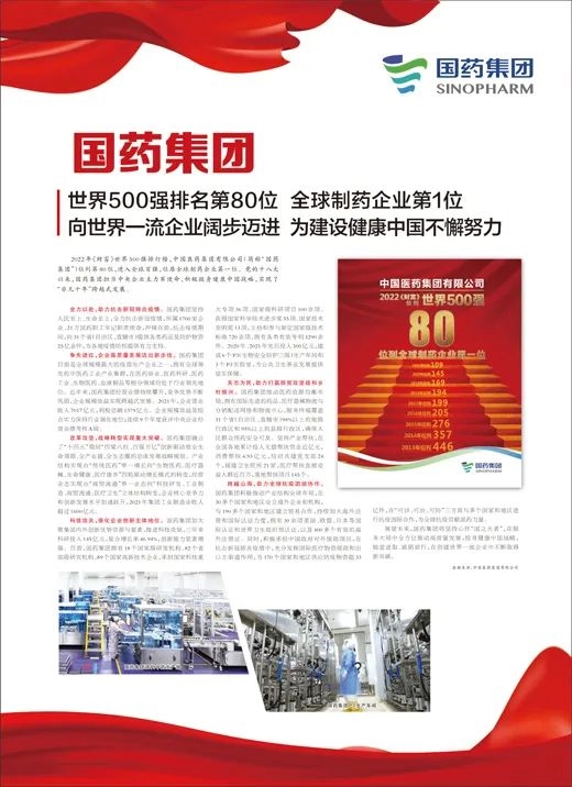 2022年《财富》世界500强排行榜,中国医药集团有限公司(简称“沙龙娱乐城 ”)位列第80位,进入全球百强,位居全球制药企业第一位。党的十八大以来,沙龙娱乐城 担当中央企业主力军使命,积极投身健康中国战略,实现了“非凡十年”跨越式发展。