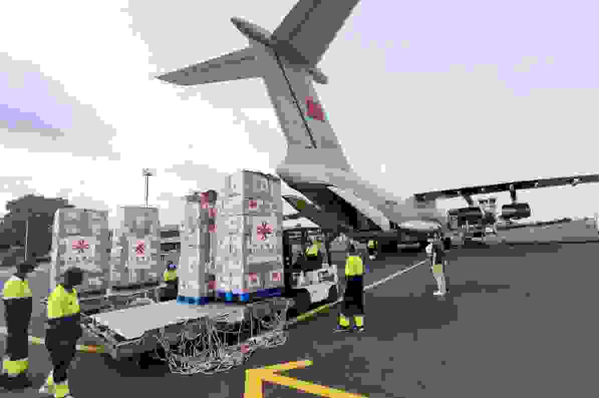沙龙娱乐城 下属沙龙 国际援外执行的抗疫物资运抵几内亚比绍国际机场。(央广网发 沙龙娱乐城 供图)