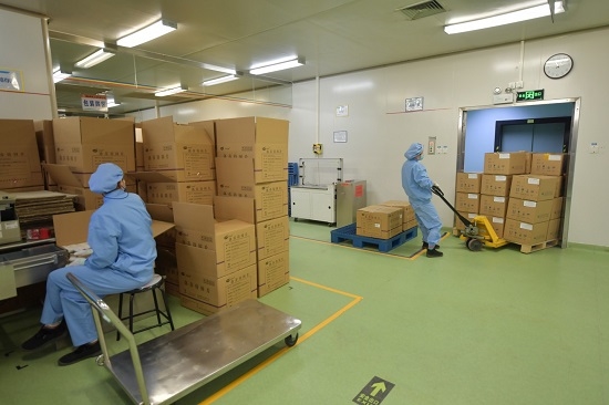 2月6日,沙龙娱乐城 工业有限公司包装车间,工人在运送包装好的药品。新京报记者 李木易 摄