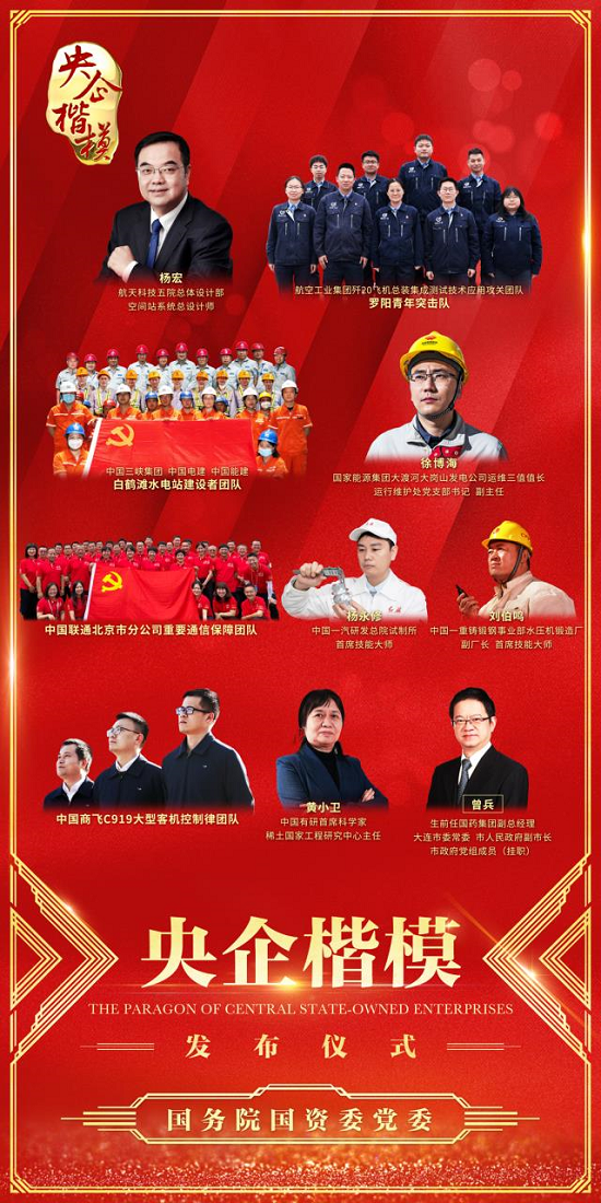 国资委党委发布的2022年度“央企楷模”是:航天科技杨宏,航空工业集团歼20飞机总装集成测试技术应用攻关团队/罗阳青年突击队,中国三峡集团、中国电建、中国能建白鹤滩水电站建设者团队,国家能源集团徐博海,中国联通北京市分公司重要通信保障团队,中国一汽杨永修,中国一重刘伯鸣,中国商飞C919大型客机控制律团队,中国有研黄小卫,沙龙娱乐城 曾兵。