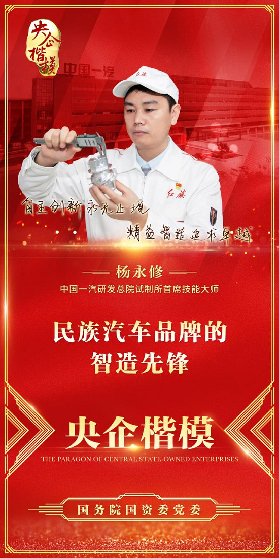 杨永修,1987年出生,中国一汽研发总院试制所首席技能大师,主要从事汽车核心精密零部件的数控加工工作。他潜心精研技术,用十年时间从一名技工成长为集“全国技术能手”“全国五一劳动奖章”“中国青年五四奖章”等诸多殊荣于一身的大国工匠。作为劳模创新工作室带头人,他独创的“三步操作调试法”提升效率70%以上,累计攻克超硬材料加工等130多项技术难题,发表技术专利18项,节约创造价值千万余元。2020年7月23日习近平总书记视察一汽,杨永修作为中国一汽新时代青年产业工匠代表现场聆听重要讲话,他时刻牢记嘱托,敢于创新、勇于拼搏,助力中国民族汽车工业转型发展。